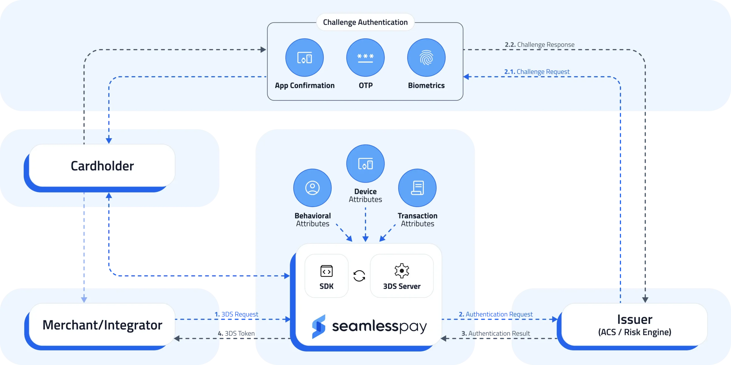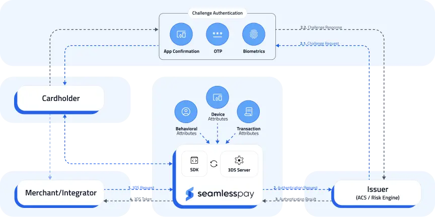 The transaction is sent to SeamlessPay’s 3DS Server, where authentication logic classifies the risk profile and prepares the request for the issuer.